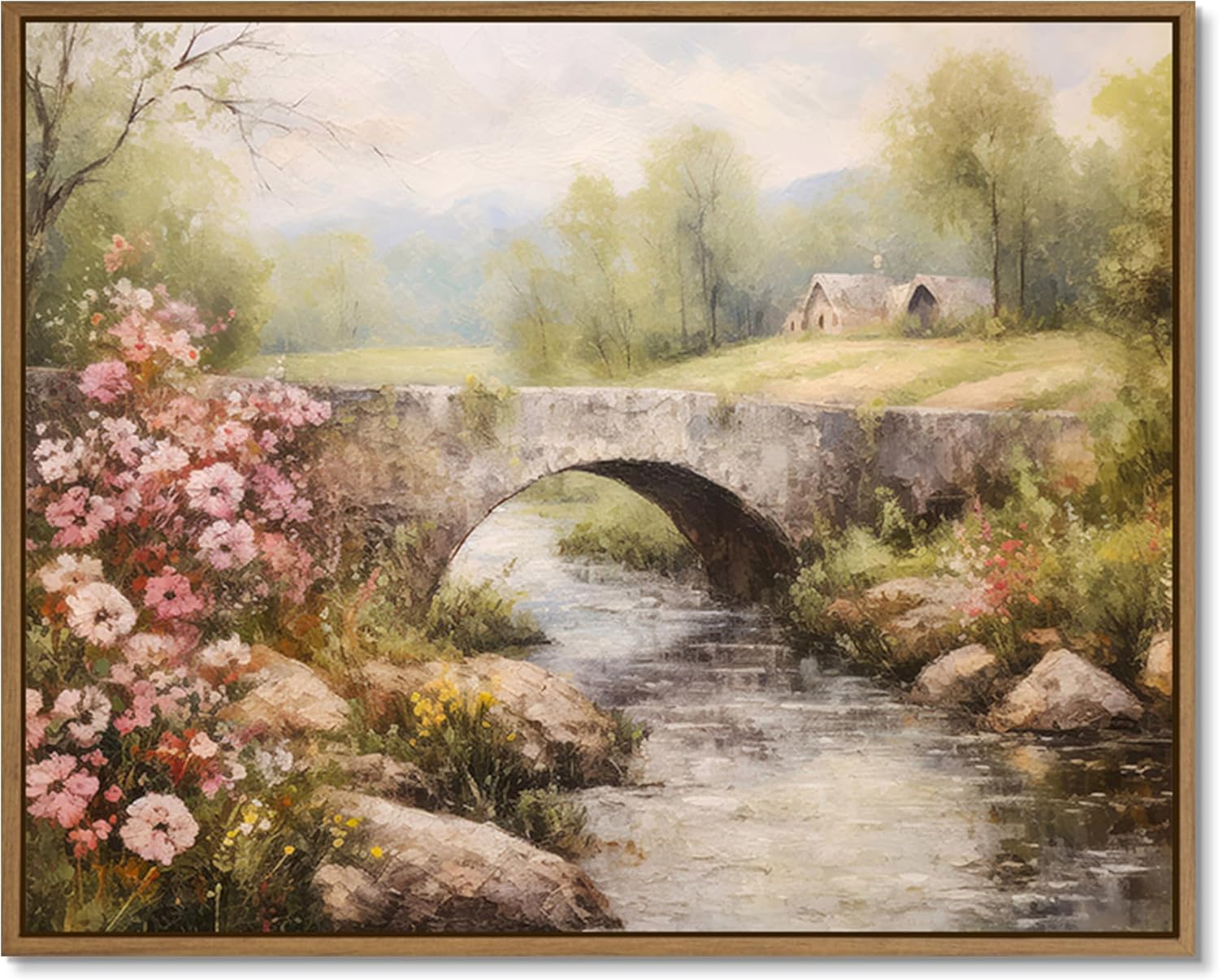 Gardenia Art’s framed canvas print showcases a peaceful mountain bridge over a river, surrounded by blooming flowers and charming cottages. Perfect for adding rustic elegance and natural beauty to any room.