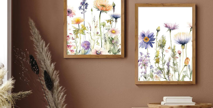 Each piece features vivid watercolor and canvas paintings capturing blooming flowers, wildfields, and serene countryside views, adding color and life to your living spaces.